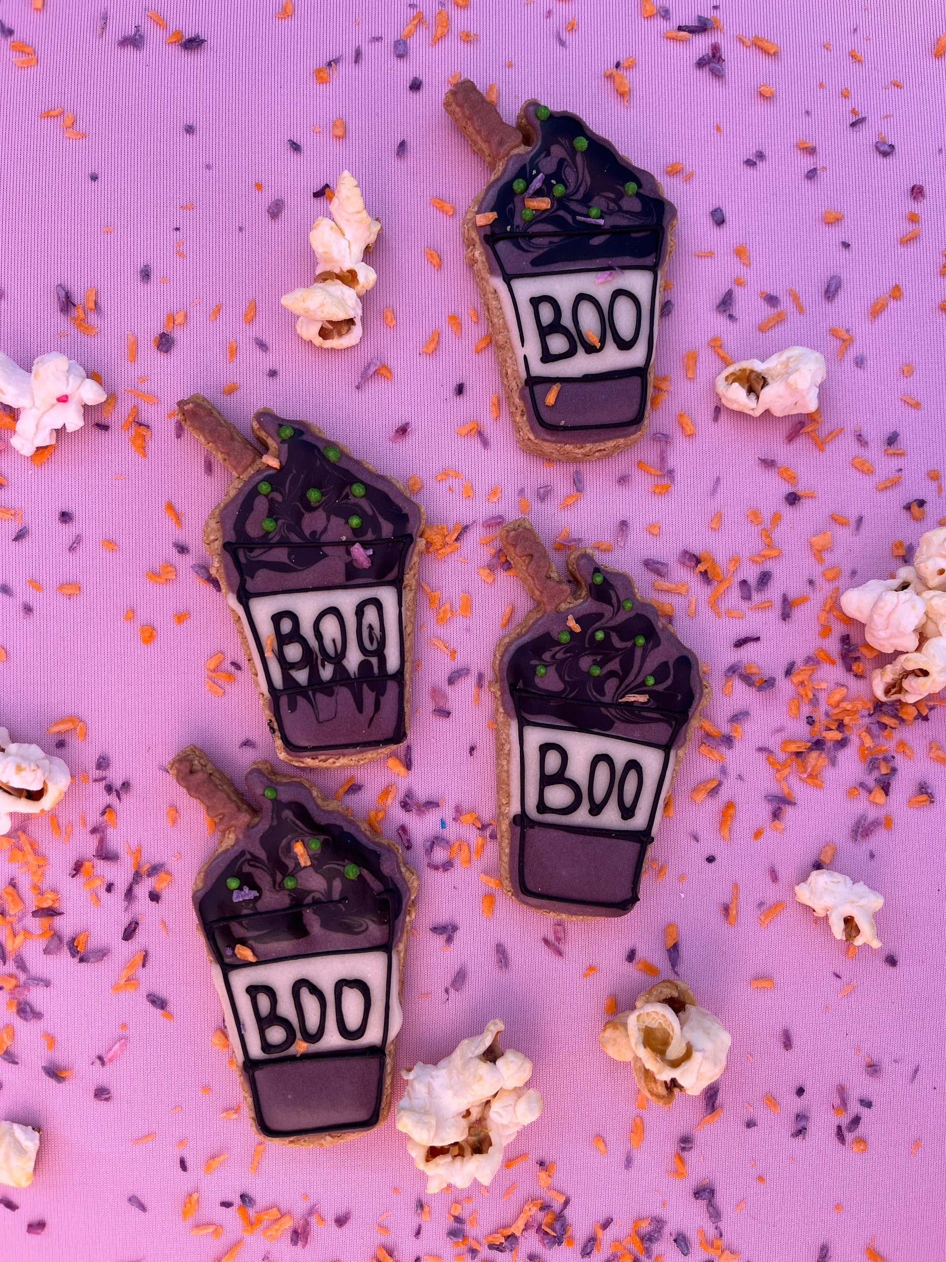 Oat flour, peanut butter, dog friendly icing (if your dog has any allergies please feel free to contact us for any further information about or icing ingredients)